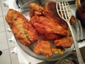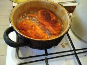 Ha ez megvan, az egyik felét ráhajtjuk, a széleit jól lenyomkodjuk, majd a rántott húsnál szokásos módon, lisztbe, felvert tojásba, zsemlemorzsába forgatjuk, majd olajban pirosra sütjük. A félősebbek összetűzhetik hústűvel vagy fogpiszkálóval, de ha ügyesen panírozzuk, nem folyik ki a töltelék anélkül sem. Gyönyörű szeletek lesznek..